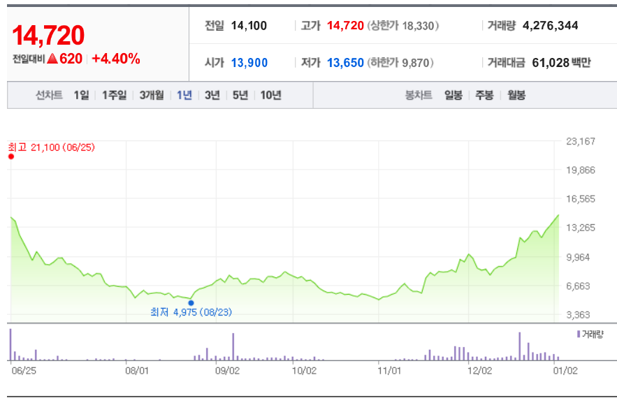 1월 3일 기준, 거래량은 4,276,344주로 매우 활발하며 거래대금은 61,028백만 원으로 높은 수준을 기록하였습니다. 이러한 높은 거래량은 투자자들의 관심이 집중되고 있음을 나타내며, 기술주에 대한 시장의 강한 신뢰를 보여줍니다.