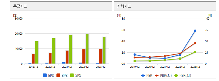 PER은 비교적 안정적인 수준을 유지하고 있으며, PBR은 성장 가능성을 반영하고 있습니다. 또한 EPS는 매년 상승세를 보이며 주주가치 제고 가능성을 시사합니다.