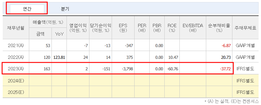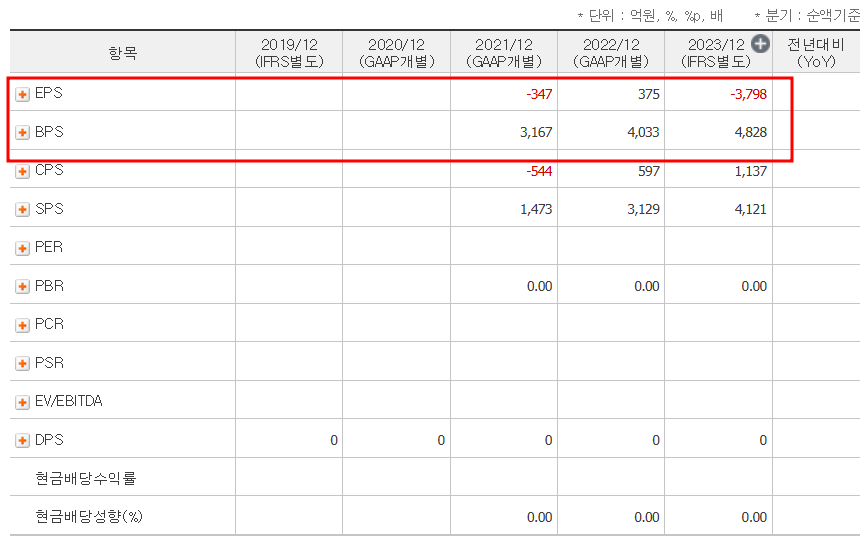 - EPS(주당순이익): 2023년 기준 -3,798원으로 전년 대비 크게 감소하였습니다.