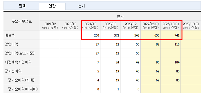 - 매출액: 2021년 260억 원 → 2023년 548억 원으로 2배 이상 성장