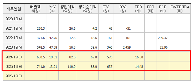2024년 매출과 영업이익은 각각 650억 원과 82억 원으로 전망되며, 이는 전년 대비 18.6% 및 64% 증가하는 수치입니다. 또한, 2025년에는 매출이 800억 원을 돌파할 가능성도 언급되고 있습니다.