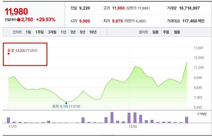 에이럭스는 12월 16일 기준 주가 11,980원을 기록하며 29.93% 상승, 상한가에 도달했습니다. 전일 종가 9,220원 대비 무려 2,760원 급등했으며, 거래량도 10,676,014주로 폭발적인 수요를 보였습니다.