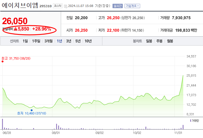 전일 종가 20,200원에서 시작해 최고 26,250원까지 상승한 에이치브이엠은 오늘 단기간에 급격한 상승세를 보였습니다. 이와 같은 거래량과 거래대금은 미국 대선에서 트럼프가 승리하고 공개 지지를 했던 일론 머스크의 스페이스X 1차 벤더인 에이치브이엠이 시장의 큰 관심과 투자자들의 활발한 거래를 반영합니다. 최근 주가 급등의 배경에는 기술적 분석에 따른 단기 투자자들의 매수세가 주요 요인으로 작용한 것으로 분석됩니다.