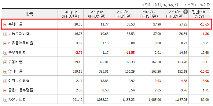 에코바이오의 부채비율은 27.25%로, 업계 평균 대비 낮은 수준을 유지하고 있습니다. 이는 회사가 장기적인 성장을 위한 재무적 안정성을 확보하고 있음을 보여줍니다.