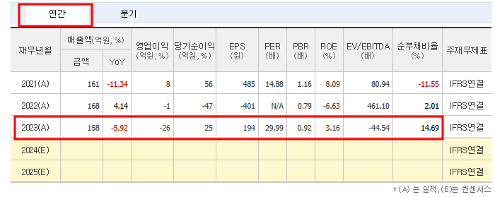 - 2023년: 예상 매출액은 158억 원으로 감소할 것으로 보이며, 영업손실은 -26억 원으로 적자 폭이 확대될 전망입니다. 하지만 당기순이익은 24억 원으로 흑자전환이 예상되고 있어 긍정적인 흐름을 보이고 있습니다.