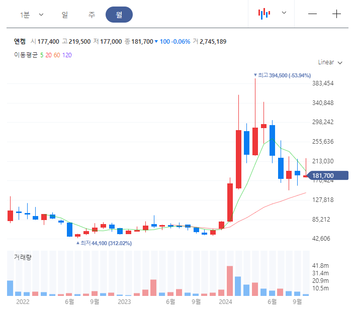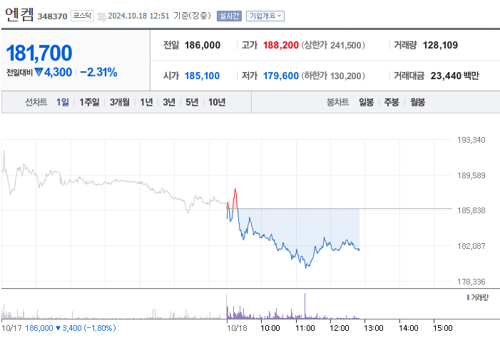 1. 엔켐 주가 현황 (2024년 10월 18일 기준)