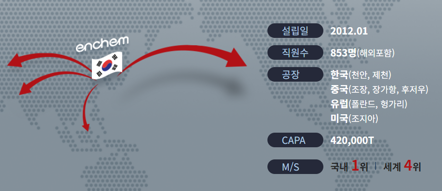 엔켐은 이차전지 전해액 제조업체로, 특히 전기차 배터리 관련 시장에서 중요한 역할을 하고 있습니다. 글로벌 전기차 수요 확대와 더불어 엔켐은 북미와 유럽을 포함한 주요 시장에서 사업을 확장하고 있습니다.