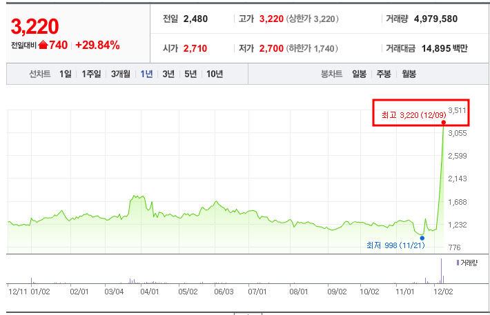 - 52주 최고가/최저가: 최고가 3,220원(2024년 12월 9일), 최저가 998원(2024년 11월 21일)