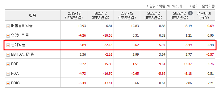 - ROE(자기자본이익률): -12.952%