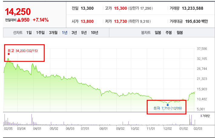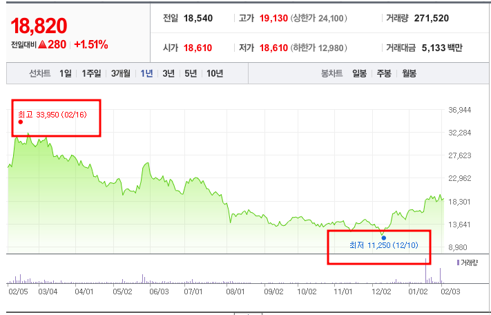 - 52주최고가/최저가:33,950원/11,250원