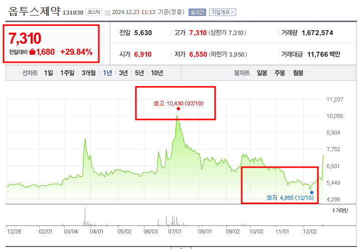 오늘 삼천당제약이 상한가를 기록하면서 종속기업인 옵투스제약도 동반 상한가를 기록했습니다. 옵투스제약(131030)은 2024년 12월 23일 기준 주가가 7,310원으로 급등하며 수출 및 글로벌 제약사로의 도약 가능성을 보여주고 있습니다.