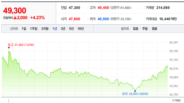 - 52주 최저가: 29,950원 (2024년 9월 9일)