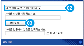 내 정보를 어떤 형식으로 가져올지를 선택하는데 .pfx, .p12를 선택합니다. 그리고 찾아보기 버튼을 클릭 해서 내 컴퓨터에 있는 인증서를 찾습니다. 위에서 설명한 내보내기를 통해서 내보낸 파일을 찾을 수 있습니다.