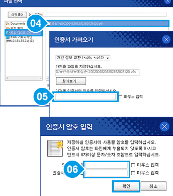 4. 인증서 가져오기 암호입력 및 인증서 암호 입력