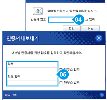 읽어올 인증서의 암호를 입력하고 내보낼 인증서의 암호를 입력합니다.