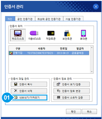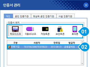 - 저장 매체 선택: 인증서를 저장하는 저장 매체는 바이러스 감염이나 불량이 없는지 체크하고 사용합니다.