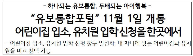 - 편리한 원스톱 서비스: 유보통합포털을 통해 유치원과 어린이집의 입소·입학을 한 곳에서 신청할 수 있어, 학부모의 시간과 노력을 절감할 수 있습니다.