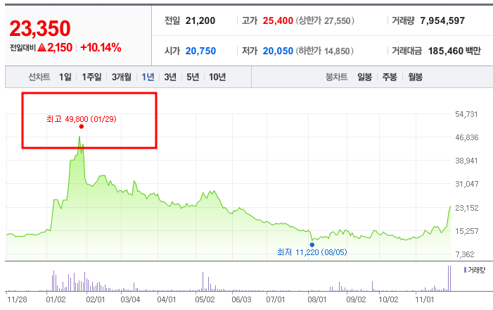 - 최근 1일 변동: 개장가 20,750원에서 최고가 25,400원을 기록하며 큰 폭의 상승