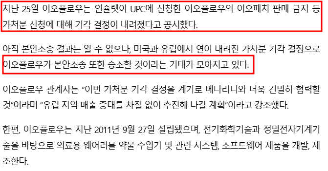 이오플로우는 유럽 특허 소송에서 승소하며 의료기기 제품의 시장 경쟁력을 강화할 수 있는 발판을 마련했습니다. 특히, 유럽 내 독점적 지위를 확보할 가능성이 높아 향후 매출 확대가 기대됩니다.