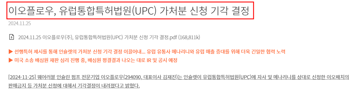 이오플로우가 미국 의료기기업체 인슐렛이 제기한 유럽특허 소송에서 승소했다는 소식에 주가가 이틀 연속 상한가를 기록했습니다. 이오플로우(294090)는 의료기기 제조업체로, 2024년 11월 27일 주가는 9,030원이며, 전일 대비 20.08% 상승했습니다. 이오플로우 주가 전망 및 목표주가, 소송 승소 및 주가 상승 요인을 알아보겠습니다.