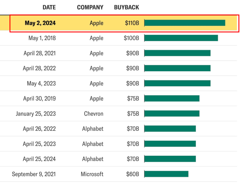 2024년 5월 2일 장이 마감된 후에 1,100억달러(약 150조원)의 자사주 매입을 발표했습니다. 이 규모는 전년 동기와 비교해서 약 22% 늘어난 수준입니다.