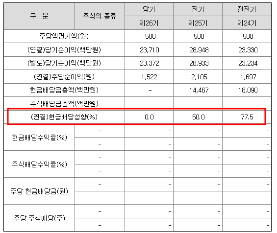 • 주주 가치 제고 정책: 주식 5%인 768,029주 자사주 소각, 향후 3년간 최소 50% 배당 성향을 유지하기로 했습니다.