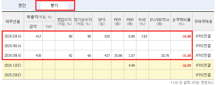 • 2024년 3분기 매출액은 430억 원으로 전년 동기 417억 원 대비 3% 증가했습니다.