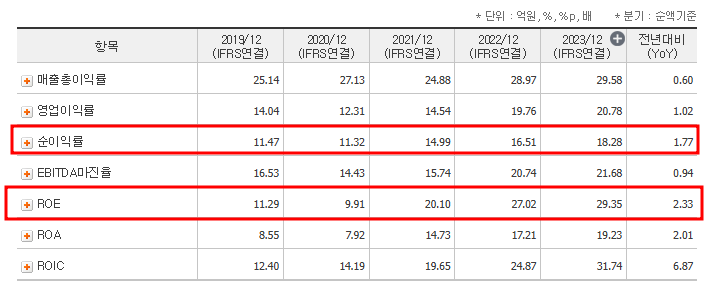 • ROE(자기자본이익률): 27.27%로 2022년 29.35% 대비 약간 감소했으나 여전히 업계 상위권에 속합니다.