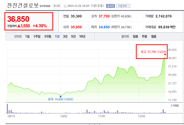 전진건설로봇은 최근 글로벌 이슈와 맞물려 주가가 강세를 보이고 있습니다. 2024년 12월 20일 기준으로 전진건설로봇의 주가는 36,350원으로 전일 대비 2.97%(1,050원) 상승했습니다.