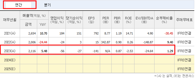- 2023년 매출액(추정치): 2,116억 원, 영업손실 -56억 원