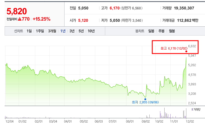 1년 차트를 살펴보면, 주가는 9월 최저점인 2,855원에서 급등하여 현재는 연고점을 기록 중입니다. 10월부터 주가가 꾸준히 상승세를 보였으며, 이는 가상자산 시장 회복 및 관련 법안 소식과의 연관성으로 보입니다.