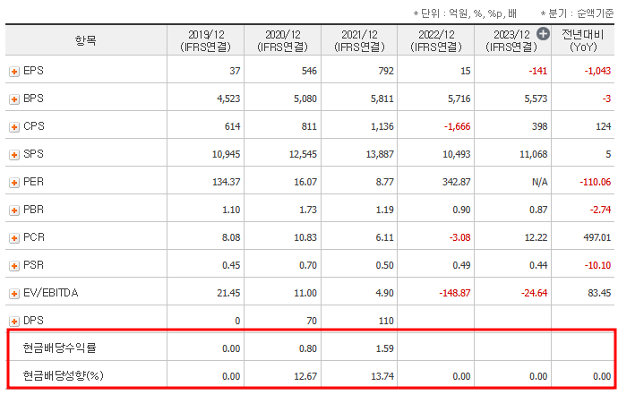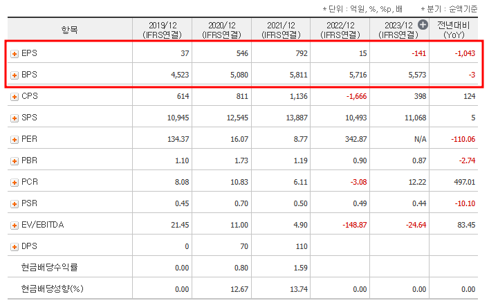 PBR은 1 미만으로, 회사의 주가가 순자산 대비 저평가되었을 가능성을 암시합니다. 이는 자산가치에 비해 주가가 저평가된 상태라는 긍정적인 신호로 읽을 수 있습니다. - EPS: -141원