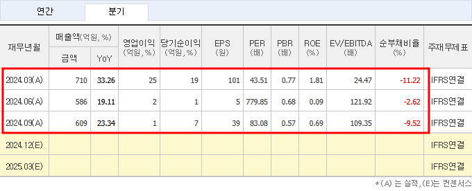 - 3분기 매출: 609억 원, 영업이익 1억 원