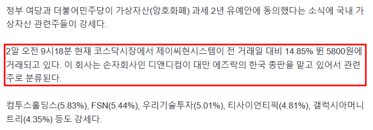 정부와 정치권에서 가상자산에 대한 과세를 2년 유예하기로 동의했다는 소식이 전해지면서 가상자산 및 암호화폐 관련주들이 강세를 보이고 있습니다. 제이씨현시스템 주가는 2일 장중 17% 급등하며 주목받고 있습니다. 제이씨현시스템의 주가 전망, 목표주가, PER, PBR, EPS, 실적 및 투자포인트를 자세하게 알아보겠습니다.