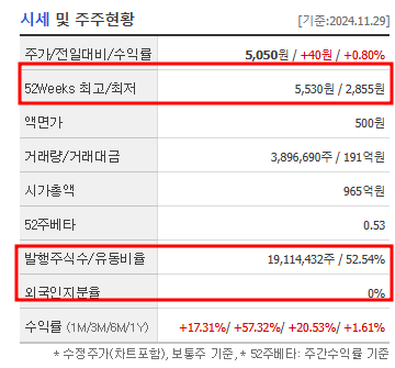 특히 외국인 소진율이 0%로 나타나는 점은 눈에 띄는 부분입니다. 이는 외국인의 매수는 부진하나 국내 투자자들 사이에서 주식이 활발히 거래되고 있음을 의미합니다.