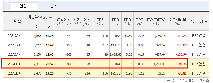 2024년 예상 매출은 7,419억 원으로 전년 대비 약 20% 증가가 기대되며, 영업손실 규모는 다소 축소될 전망입니다.