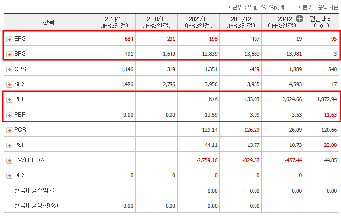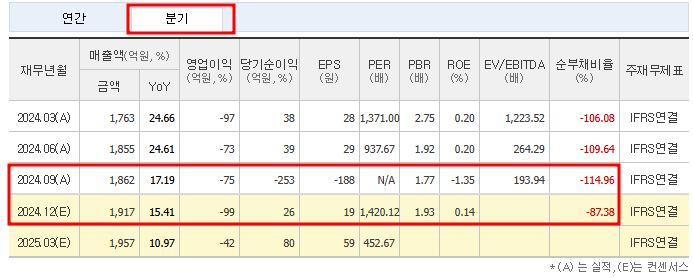 - PER: -532.14배(적자 지속).