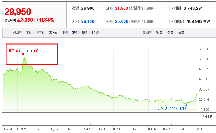 - 52주 최고가/최저가: 최고 60,200원(2024년 1월 11일), 최저 21,200원(2024년 11월 15일).