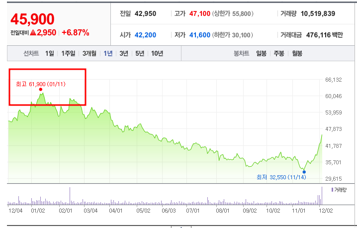 • 52주 최고가/최저가: 최고 61,900원(2024년 1월 11일), 최저 32,550원(2024년 11월 14일).
