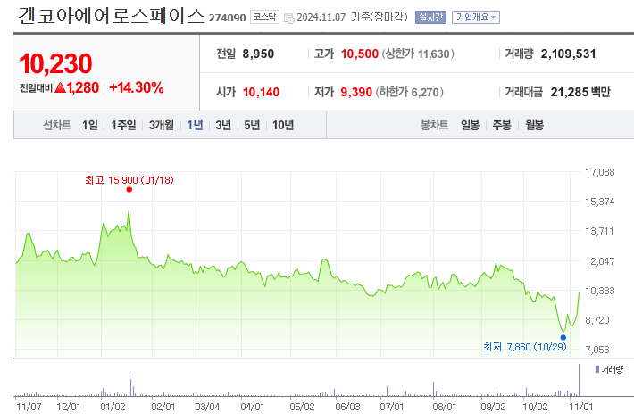 켄코아에어로스페이스(코드: 274090)는 항공기 부품 제조 및 항공기 설계와 같은 전문 역량을 가진 항공우주 관련 기업입니다. 2024년 11월 7일 현재 주가는 10,320원으로, 전일 대비 15.31% 상승했습니다. 이는 미국 대선의 영향으로 거래량이 2,068,632주로 급증하며 활발한 거래가 이루어졌음을 시사합니다.