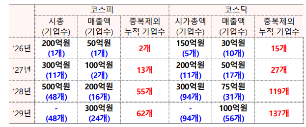 코스닥 시장 역시 현행 40억원에서 2028년 300억원까지 단계적으로 상향조정됩니다.