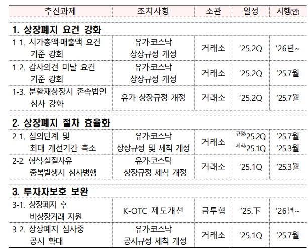 - 감사의견 미달 요건 강화: 2년 연속 감사의견 미달 시 즉시 상장폐지되는 등 비재무적 요건도 강화됩니다.