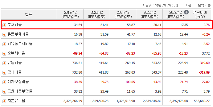 | 부채비율 (2023년) | 17.35% |