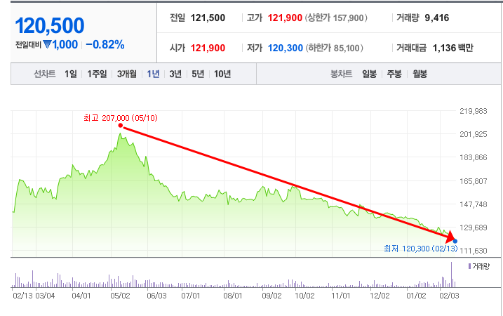 - 52주최고가/최저가: 207,000원/120,300원