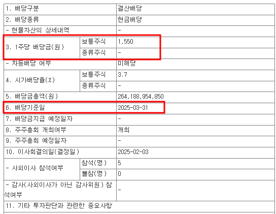 | 1주당 배당금(원) | 1,550원 (보통주 기준) |