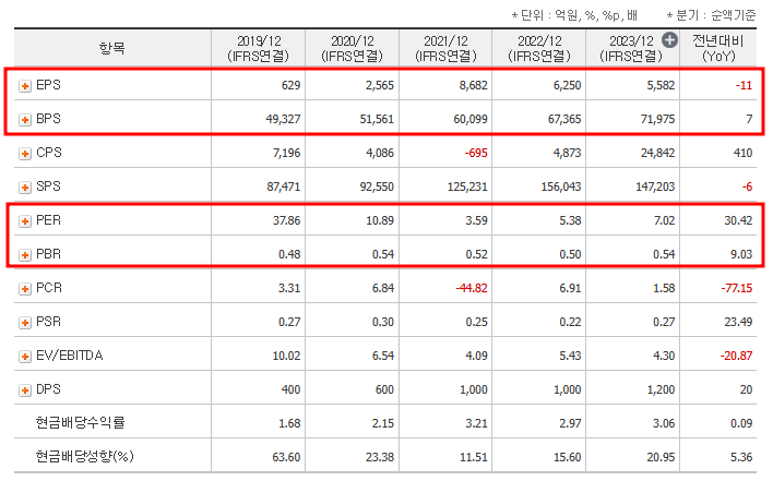 | PBR (주가순자산비율) | 0.52 | 0.58 | 0.63 | +9.02% |