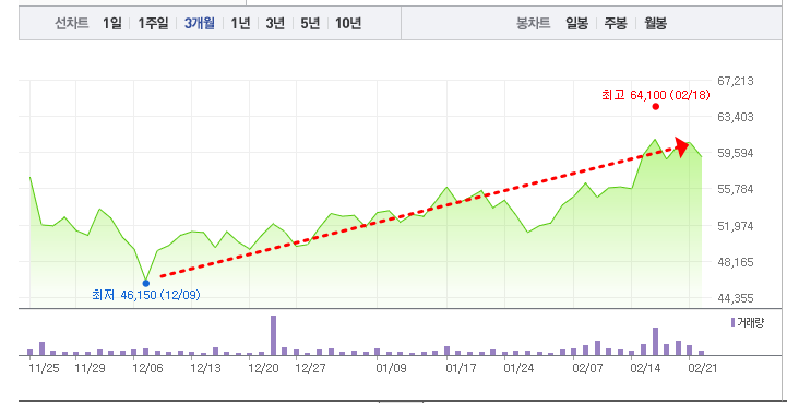 1년 차트를 보면, 2024년 5월 14일 78,900원으로 최고점을 기록한 후 하락세를 보이다가 2024년 2월 26일 41,500원에서 최저점을 형성했습니다. 이후 점진적인 반등세를 나타내고 있습니다.