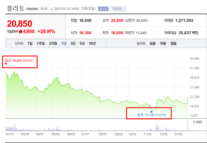 2025년 1월 31일 기준 플리토의 주가는 20,800원으로, 전일 대비 4,750원(29.60%) 상승하며 급등했습니다. 상한가(20,850원)에 근접한 움직임을 보이며 시장의 높은 관심을 받고 있습니다.