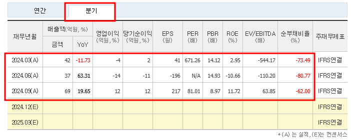 2024년 1~3분기 실적을 보면 매출은 69억 원, 영업이익 및 순이익이 각각 12억 원으로 흑자 전환 가능성을 보여줍니다.