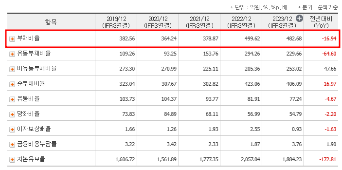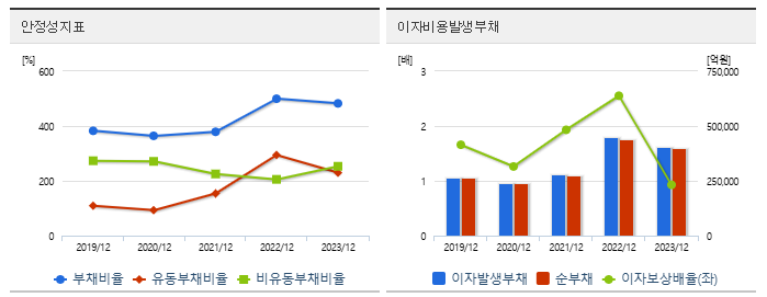 최근 부채 비율이 482.68%로 높은 수준을 유지하고 있습니다. 부채 부담이 커지면 이자비용 증가로 인해 순이익이 감소할 가능성이 있습니다.